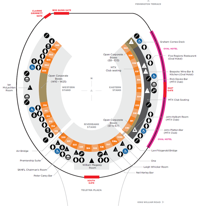- The onsite hotel (Adelaide Oval Hotel) is fully accessible by wheelchair, with all rooms, reception lounge and dining accessible via lifts.